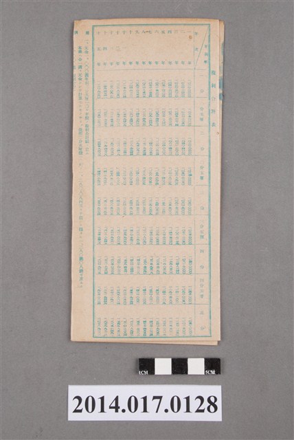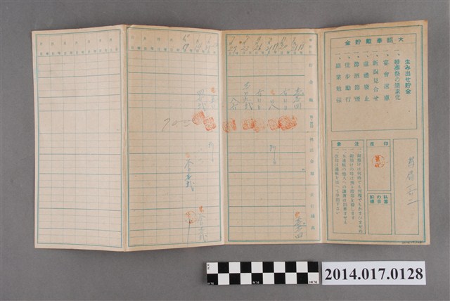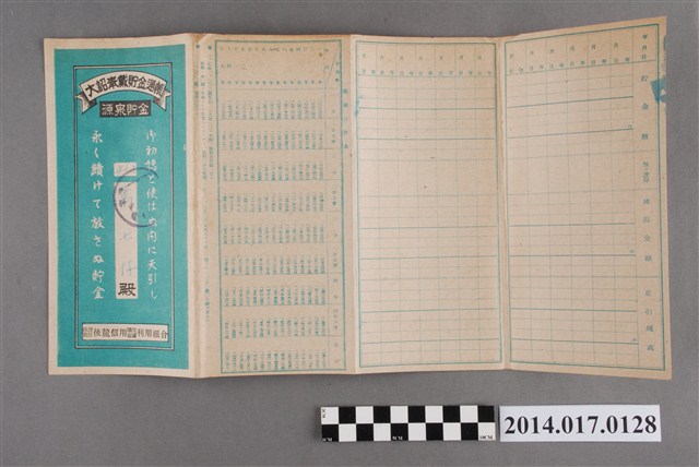 地址載為烏眉162。本物件為戰爭期間1943年~1945年期間後龍、公司寮、水尾子、二張犁、大山腳、頭湖、崎頂等地人民之銷帳儲金簿,內頁印有大詔奉戴字樣,並以婚葬儀式簡化、宴會遠慮、新謁見合せ、虛禮廢止、節酒節煙、徒步勵行、副業勉強倡導儲金,另外印有儲簿規定如:不許轉讓、改印需申請等,背頁附有複利合計表。大詔指的是1941年對美、英兩國之宣戰詔書,1942年起每個月8日定為大詔奉戴日,為日本政府為太平洋戰爭所運作的國民運動,隨著戰爭規模擴大,戰時有各項國民強迫儲蓄的舉措,以支援前線戰事,1938年日本政府為因應中日戰爭即推行有愛國儲蓄運動,本物件則為1942年後因應戰爭規模擴大後之儲蓄項目,范雅鈞指出本儲金簿為強制存款,直接由薪資扣除。