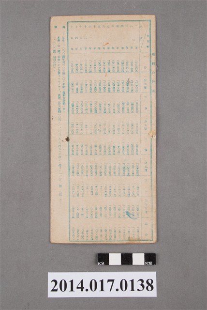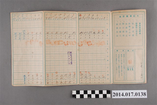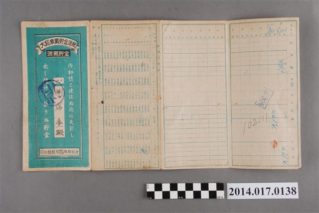 地址載為後龍270番地。本物件為戰爭期間1943年~1945年期間後龍、公司寮、水尾子、二張犁、大山腳、頭湖、崎頂等地人民之銷帳儲金簿,內頁印有大詔奉戴字樣,並以婚葬儀式簡化、宴會遠慮、新謁見合せ、虛禮廢止、節酒節煙、徒步勵行、副業勉強倡導儲金,另外印有儲簿規定如:不許轉讓、改印需申請等,背頁附有複利合計表。大詔指的是1941年對美、英兩國之宣戰詔書,1942年起每個月8日定為大詔奉戴日,為日本政府為太平洋戰爭所運作的國民運動,隨著戰爭規模擴大,戰時有各項國民強迫儲蓄的舉措,以支援前線戰事,1938年日本政府為因應中日戰爭即推行有愛國儲蓄運動,本物件則為1942年後因應戰爭規模擴大後之儲蓄項目,范雅鈞指出本儲金簿為強制存款,直接由薪資扣除。