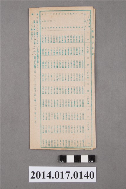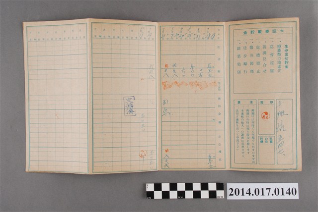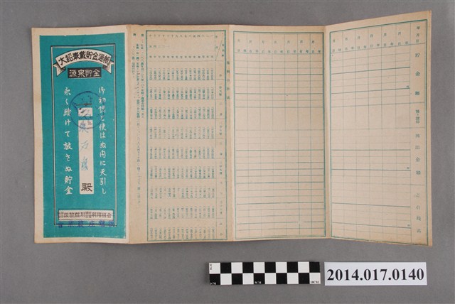 地址載為十班坑547。本物件為戰爭期間1943年~1945年期間後龍、公司寮、水尾子、二張犁、大山腳、頭湖、崎頂等地人民之銷帳儲金簿,內頁印有大詔奉戴字樣,並以婚葬儀式簡化、宴會遠慮、新謁見合せ、虛禮廢止、節酒節煙、徒步勵行、副業勉強倡導儲金,另外印有儲簿規定如:不許轉讓、改印需申請等,背頁附有複利合計表。大詔指的是1941年對美、英兩國之宣戰詔書,1942年起每個月8日定為大詔奉戴日,為日本政府為太平洋戰爭所運作的國民運動,隨著戰爭規模擴大,戰時有各項國民強迫儲蓄的舉措,以支援前線戰事,1938年日本政府為因應中日戰爭即推行有愛國儲蓄運動,本物件則為1942年後因應戰爭規模擴大後之儲蓄項目,范雅鈞指出本儲金簿為強制存款,直接由薪資扣除。