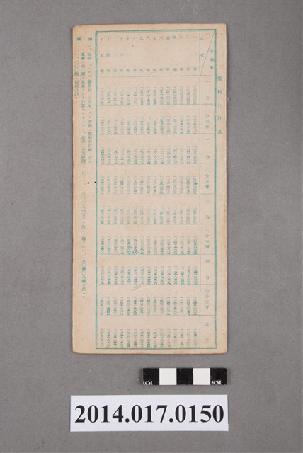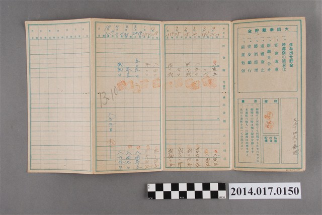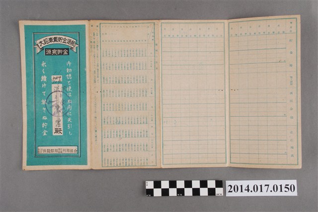 地址載為大山ア460番地。本物件為戰爭期間1943年~1945年期間後龍、公司寮、水尾子、二張犁、大山腳、頭湖、崎頂等地人民之銷帳儲金簿,內頁印有大詔奉戴字樣,並以婚葬儀式簡化、宴會遠慮、新謁見合せ、虛禮廢止、節酒節煙、徒步勵行、副業勉強倡導儲金,另外印有儲簿規定如:不許轉讓、改印需申請等,背頁附有複利合計表。大詔指的是1941年對美、英兩國之宣戰詔書,1942年起每個月8日定為大詔奉戴日,為日本政府為太平洋戰爭所運作的國民運動,隨著戰爭規模擴大,戰時有各項國民強迫儲蓄的舉措,以支援前線戰事,1938年日本政府為因應中日戰爭即推行有愛國儲蓄運動,本物件則為1942年後因應戰爭規模擴大後之儲蓄項目,范雅鈞指出本儲金簿為強制存款,直接由薪資扣除。