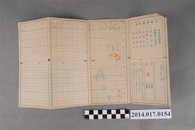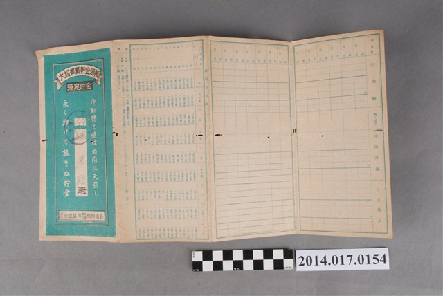 地址載為苦苓腳901。本物件為戰爭期間1943年~1945年期間後龍、公司寮、水尾子、二張犁、大山腳、頭湖、崎頂等地人民之銷帳儲金簿,內頁印有大詔奉戴字樣,並以婚葬儀式簡化、宴會遠慮、新謁見合せ、虛禮廢止、節酒節煙、徒步勵行、副業勉強倡導儲金,另外印有儲簿規定如:不許轉讓、改印需申請等,背頁附有複利合計表。大詔指的是1941年對美、英兩國之宣戰詔書,1942年起每個月8日定為大詔奉戴日,為日本政府為太平洋戰爭所運作的國民運動,隨著戰爭規模擴大,戰時有各項國民強迫儲蓄的舉措,以支援前線戰事,1938年日本政府為因應中日戰爭即推行有愛國儲蓄運動,本物件則為1942年後因應戰爭規模擴大後之儲蓄項目,范雅鈞指出本儲金簿為強制存款,直接由薪資扣除。