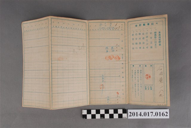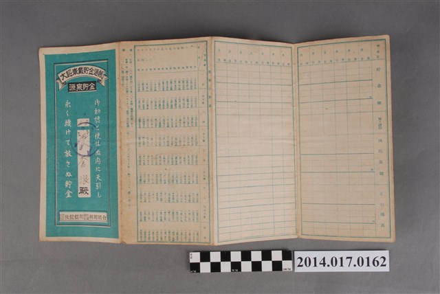 地址載為公司寮189。本物件為戰爭期間1943年~1945年期間後龍、公司寮、水尾子、二張犁、大山腳、頭湖、崎頂等地人民之銷帳儲金簿,內頁印有大詔奉戴字樣,並以婚葬儀式簡化、宴會遠慮、新謁見合せ、虛禮廢止、節酒節煙、徒步勵行、副業勉強倡導儲金,另外印有儲簿規定如:不許轉讓、改印需申請等,背頁附有複利合計表。大詔指的是1941年對美、英兩國之宣戰詔書,1942年起每個月8日定為大詔奉戴日,為日本政府為太平洋戰爭所運作的國民運動,隨著戰爭規模擴大,戰時有各項國民強迫儲蓄的舉措,以支援前線戰事,1938年日本政府為因應中日戰爭即推行有愛國儲蓄運動,本物件則為1942年後因應戰爭規模擴大後之儲蓄項目,范雅鈞指出本儲金簿為強制存款,直接由薪資扣除。
