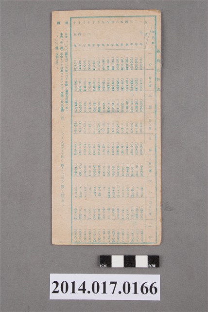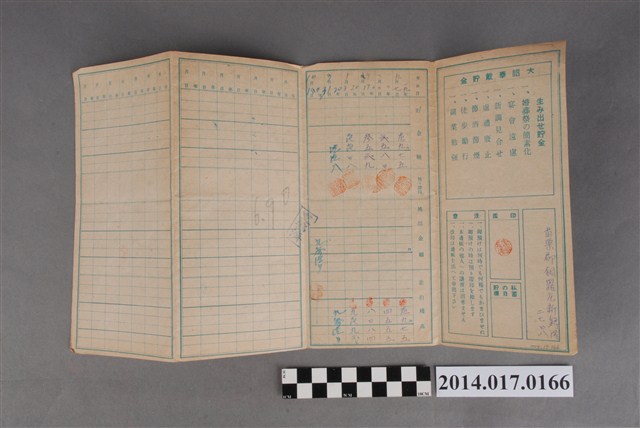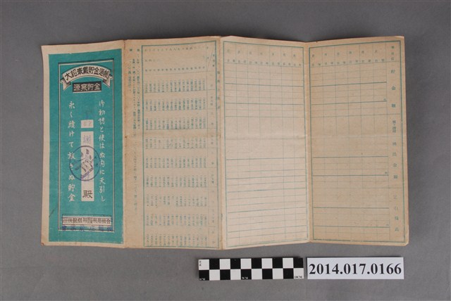 地址載為苗栗郡銅鑼庄新鷄隆2708。本物件為戰爭期間1943年~1945年期間後龍、公司寮、水尾子、二張犁、大山腳、頭湖、崎頂等地人民之銷帳儲金簿,內頁印有大詔奉戴字樣,並以婚葬儀式簡化、宴會遠慮、新謁見合せ、虛禮廢止、節酒節煙、徒步勵行、副業勉強倡導儲金,另外印有儲簿規定如:不許轉讓、改印需申請等,背頁附有複利合計表。大詔指的是1941年對美、英兩國之宣戰詔書,1942年起每個月8日定為大詔奉戴日,為日本政府為太平洋戰爭所運作的國民運動,隨著戰爭規模擴大,戰時有各項國民強迫儲蓄的舉措,以支援前線戰事,1938年日本政府為因應中日戰爭即推行有愛國儲蓄運動,本物件則為1942年後因應戰爭規模擴大後之儲蓄項目,范雅鈞指出本儲金簿為強制存款,直接由薪資扣除。
