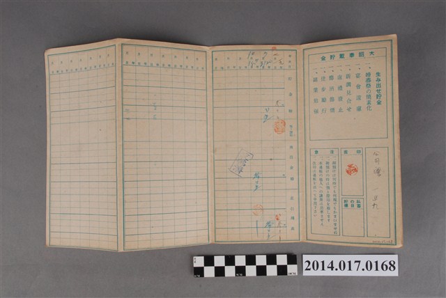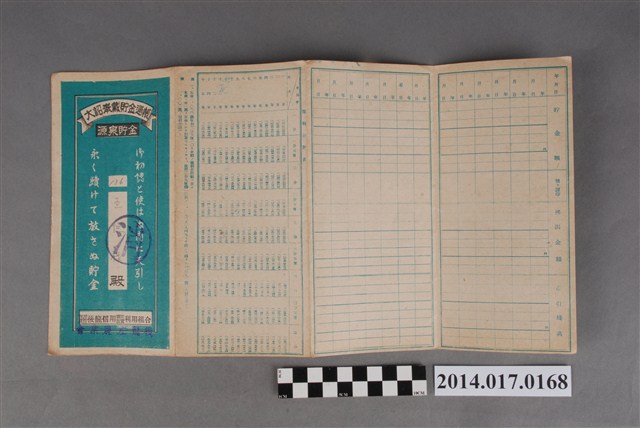 地址載為公司寮149。本物件為戰爭期間1943年~1945年期間後龍、公司寮、水尾子、二張犁、大山腳、頭湖、崎頂等地人民之銷帳儲金簿,內頁印有大詔奉戴字樣,並以婚葬儀式簡化、宴會遠慮、新謁見合せ、虛禮廢止、節酒節煙、徒步勵行、副業勉強倡導儲金,另外印有儲簿規定如:不許轉讓、改印需申請等,背頁附有複利合計表。大詔指的是1941年對美、英兩國之宣戰詔書,1942年起每個月8日定為大詔奉戴日,為日本政府為太平洋戰爭所運作的國民運動,隨著戰爭規模擴大,戰時有各項國民強迫儲蓄的舉措,以支援前線戰事,1938年日本政府為因應中日戰爭即推行有愛國儲蓄運動,本物件則為1942年後因應戰爭規模擴大後之儲蓄項目,范雅鈞指出本儲金簿為強制存款,直接由薪資扣除。