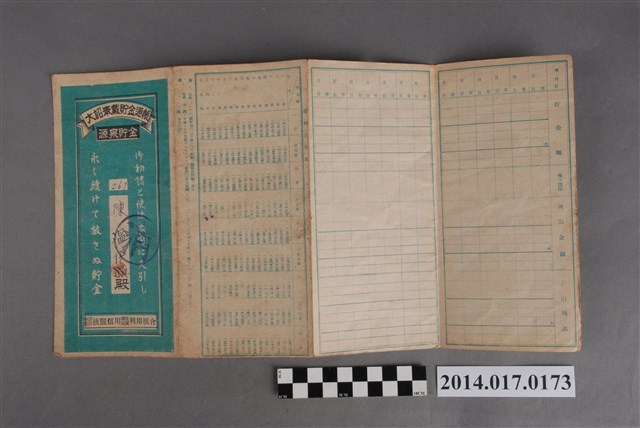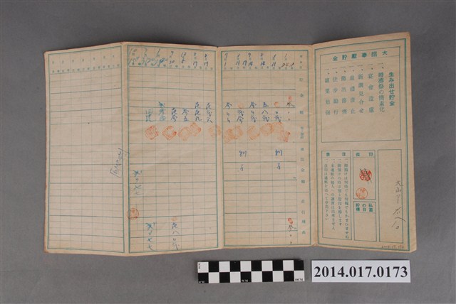 地址登載為大山ア680。本物件為戰爭期間1943年~1945年期間後龍、公司寮、水尾子、二張犁、大山腳、頭湖、崎頂等地人民之銷帳儲金簿,內頁印有大詔奉戴字樣,並以婚葬儀式簡化、宴會遠慮、新謁見合せ、虛禮廢止、節酒節煙、徒步勵行、副業勉強倡導儲金,另外印有儲簿規定如:不許轉讓、改印需申請等,背頁附有複利合計表。大詔指的是1941年對美、英兩國之宣戰詔書,1942年起每個月8日定為大詔奉戴日,為日本政府為太平洋戰爭所運作的國民運動,隨著戰爭規模擴大,戰時有各項國民強迫儲蓄的舉措,以支援前線戰事,1938年日本政府為因應中日戰爭即推行有愛國儲蓄運動,本物件則為1942年後因應戰爭規模擴大後之儲蓄項目,范雅鈞指出本儲金簿為強制存款,直接由薪資扣除。