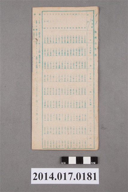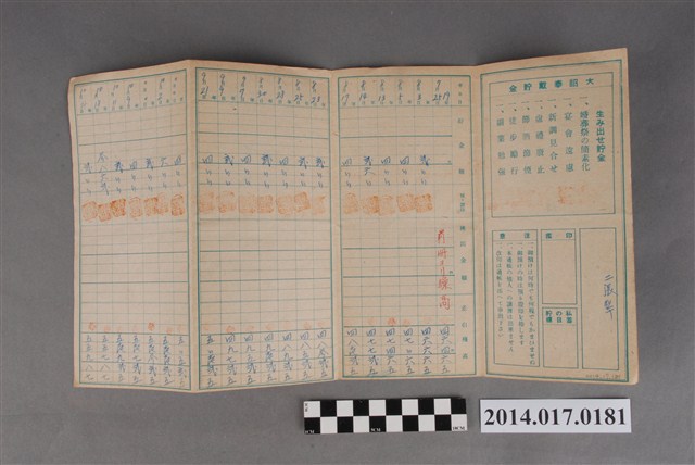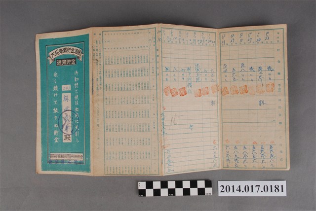 本物件為戰爭期間1943年~1945年期間後龍、公司寮、水尾子、二張犁、大山腳、頭湖、崎頂等地人民之銷帳儲金簿,內頁印有大詔奉戴字樣,並以婚葬儀式簡化、宴會遠慮、新謁見合せ、虛禮廢止、節酒節煙、徒步勵行、副業勉強倡導儲金,另外印有儲簿規定如:不許轉讓、改印需申請等,背頁附有複利合計表。大詔指的是1941年對美、英兩國之宣戰詔書,1942年起每個月8日定為大詔奉戴日,為日本政府為太平洋戰爭所運作的國民運動,隨著戰爭規模擴大,戰時有各項國民強迫儲蓄的舉措,以支援前線戰事,1938年日本政府為因應中日戰爭即推行有愛國儲蓄運動,本物件則為1942年後因應戰爭規模擴大後之儲蓄項目,范雅鈞指出本儲金簿為強制存款,直接由薪資扣除。