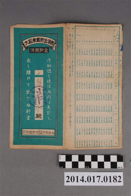 地址登載為水尾子1022。本物件為戰爭期間1943年~1945年期間後龍、公司寮、水尾子、二張犁、大山腳、頭湖、崎頂等地人民之銷帳儲金簿,內頁印有大詔奉戴字樣,並以婚葬儀式簡化、宴會遠慮、新謁見合せ、虛禮廢止、節酒節煙、徒步勵行、副業勉強倡導儲金,另外印有儲簿規定如:不許轉讓、改印需申請等,背頁附有複利合計表。大詔指的是1941年對美、英兩國之宣戰詔書,1942年起每個月8日定為大詔奉戴日,為日本政府為太平洋戰爭所運作的國民運動,隨著戰爭規模擴大,戰時有各項國民強迫儲蓄的舉措,以支援前線戰事,1938年日本政府為因應中日戰爭即推行有愛國儲蓄運動,本物件則為1942年後因應戰爭規模擴大後之儲蓄項目,范雅鈞指出本儲金簿為強制存款,直接由薪資扣除。