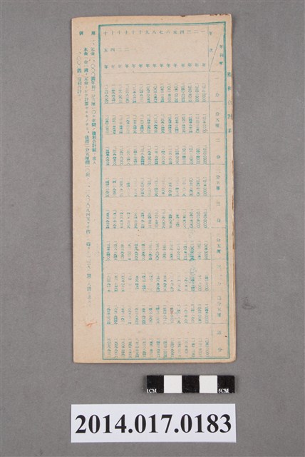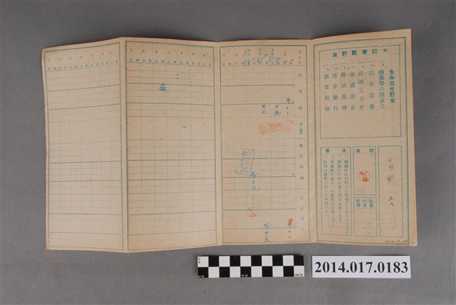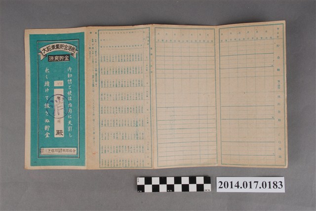 地址登載為公司寮158。本物件為戰爭期間1943年~1945年期間後龍、公司寮、水尾子、二張犁、大山腳、頭湖、崎頂等地人民之銷帳儲金簿,內頁印有大詔奉戴字樣,並以婚葬儀式簡化、宴會遠慮、新謁見合せ、虛禮廢止、節酒節煙、徒步勵行、副業勉強倡導儲金,另外印有儲簿規定如:不許轉讓、改印需申請等,背頁附有複利合計表。大詔指的是1941年對美、英兩國之宣戰詔書,1942年起每個月8日定為大詔奉戴日,為日本政府為太平洋戰爭所運作的國民運動,隨著戰爭規模擴大,戰時有各項國民強迫儲蓄的舉措,以支援前線戰事,1938年日本政府為因應中日戰爭即推行有愛國儲蓄運動,本物件則為1942年後因應戰爭規模擴大後之儲蓄項目,范雅鈞指出本儲金簿為強制存款,直接由薪資扣除。