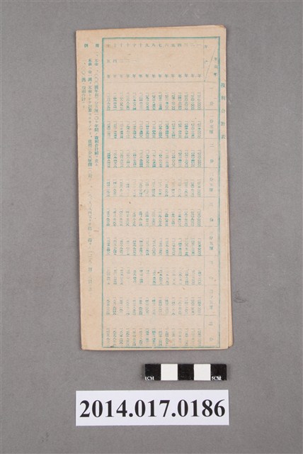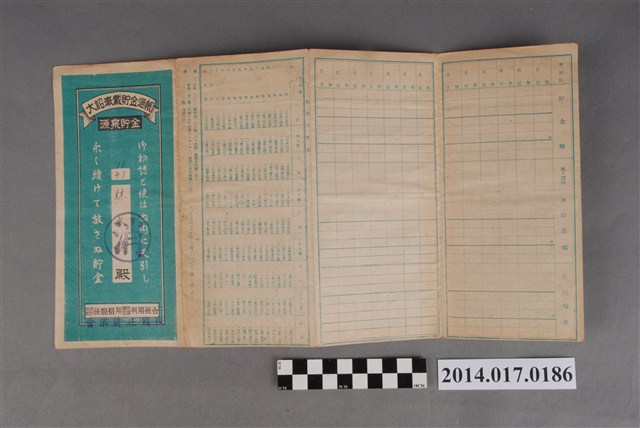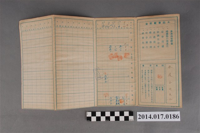 地址登載為水尾子792。本物件為戰爭期間1943年~1945年期間後龍、公司寮、水尾子、二張犁、大山腳、頭湖、崎頂等地人民之銷帳儲金簿,內頁印有大詔奉戴字樣,並以婚葬儀式簡化、宴會遠慮、新謁見合せ、虛禮廢止、節酒節煙、徒步勵行、副業勉強倡導儲金,另外印有儲簿規定如:不許轉讓、改印需申請等,背頁附有複利合計表。大詔指的是1941年對美、英兩國之宣戰詔書,1942年起每個月8日定為大詔奉戴日,為日本政府為太平洋戰爭所運作的國民運動,隨著戰爭規模擴大,戰時有各項國民強迫儲蓄的舉措,以支援前線戰事,1938年日本政府為因應中日戰爭即推行有愛國儲蓄運動,本物件則為1942年後因應戰爭規模擴大後之儲蓄項目,范雅鈞指出本儲金簿為強制存款,直接由薪資扣除。