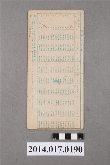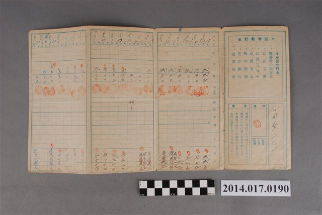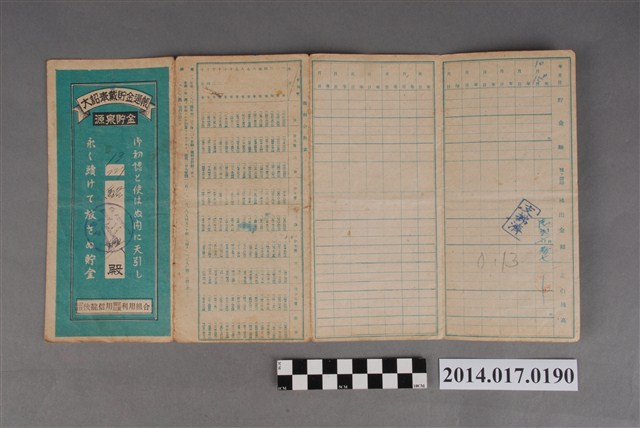 地址登載為公司寮161。本物件為戰爭期間1943年~1945年期間後龍、公司寮、水尾子、二張犁、大山腳、頭湖、崎頂等地人民之銷帳儲金簿,內頁印有大詔奉戴字樣,並以婚葬儀式簡化、宴會遠慮、新謁見合せ、虛禮廢止、節酒節煙、徒步勵行、副業勉強倡導儲金,另外印有儲簿規定如:不許轉讓、改印需申請等,背頁附有複利合計表。大詔指的是1941年對美、英兩國之宣戰詔書,1942年起每個月8日定為大詔奉戴日,為日本政府為太平洋戰爭所運作的國民運動,隨著戰爭規模擴大,戰時有各項國民強迫儲蓄的舉措,以支援前線戰事,1938年日本政府為因應中日戰爭即推行有愛國儲蓄運動,本物件則為1942年後因應戰爭規模擴大後之儲蓄項目,范雅鈞指出本儲金簿為強制存款,直接由薪資扣除。