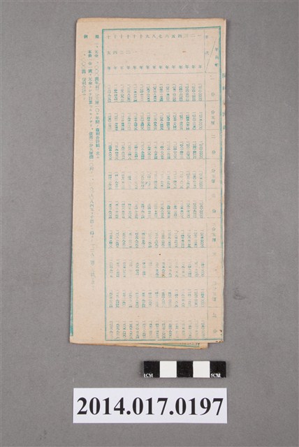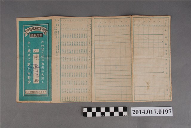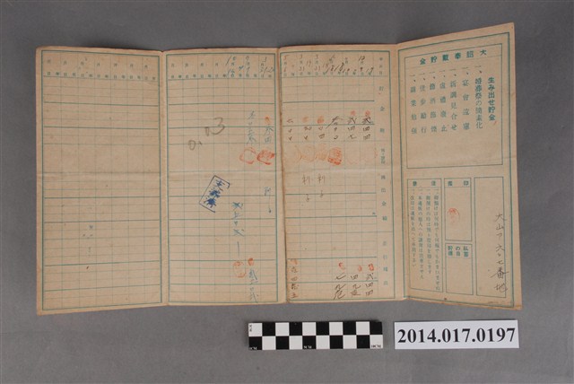 地址登載為大山ア607番地。本物件為戰爭期間1943年~1945年期間後龍、公司寮、水尾子、二張犁、大山腳、頭湖、崎頂等地人民之銷帳儲金簿,內頁印有大詔奉戴字樣,並以婚葬儀式簡化、宴會遠慮、新謁見合せ、虛禮廢止、節酒節煙、徒步勵行、副業勉強倡導儲金,另外印有儲簿規定如:不許轉讓、改印需申請等,背頁附有複利合計表。大詔指的是1941年對美、英兩國之宣戰詔書,1942年起每個月8日定為大詔奉戴日,為日本政府為太平洋戰爭所運作的國民運動,隨著戰爭規模擴大,戰時有各項國民強迫儲蓄的舉措,以支援前線戰事,1938年日本政府為因應中日戰爭即推行有愛國儲蓄運動,本物件則為1942年後因應戰爭規模擴大後之儲蓄項目,范雅鈞指出本儲金簿為強制存款,直接由薪資扣除。