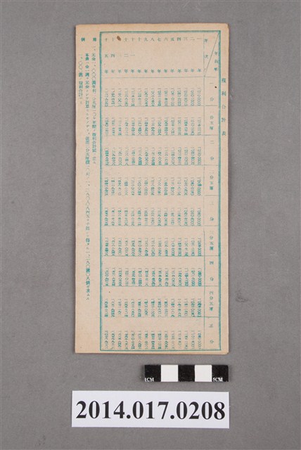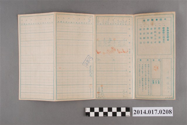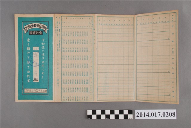 地址載為十班坑50。本物件為戰爭期間1943年~1945年期間後龍、公司寮、水尾子、二張犁、大山腳、頭湖、崎頂等地人民之銷帳儲金簿,內頁印有大詔奉戴字樣,並以婚葬儀式簡化、宴會遠慮、新謁見合せ、虛禮廢止、節酒節煙、徒步勵行、副業勉強倡導儲金,另外印有儲簿規定如:不許轉讓、改印需申請等,背頁附有複利合計表。大詔指的是1941年對美、英兩國之宣戰詔書,1942年起每個月8日定為大詔奉戴日,為日本政府為太平洋戰爭所運作的國民運動,隨著戰爭規模擴大,戰時有各項國民強迫儲蓄的舉措,以支援前線戰事,1938年日本政府為因應中日戰爭即推行有愛國儲蓄運動,本物件則為1942年後因應戰爭規模擴大後之儲蓄項目,范雅鈞指出本儲金簿為強制存款,直接由薪資扣除。
