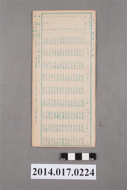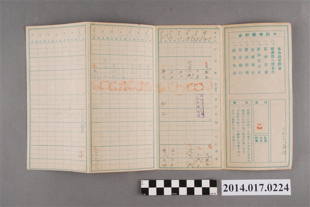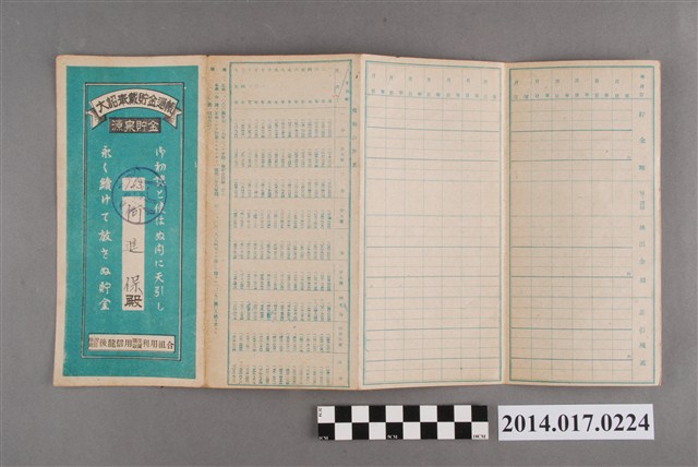 地址載為大庄238番地。本物件為戰爭期間1943年~1945年期間後龍、公司寮、水尾子、二張犁、大山腳、頭湖、崎頂等地人民之銷帳儲金簿,內頁印有大詔奉戴字樣,並以婚葬儀式簡化、宴會遠慮、新謁見合せ、虛禮廢止、節酒節煙、徒步勵行、副業勉強倡導儲金,另外印有儲簿規定如:不許轉讓、改印需申請等,背頁附有複利合計表。大詔指的是1941年對美、英兩國之宣戰詔書,1942年起每個月8日定為大詔奉戴日,為日本政府為太平洋戰爭所運作的國民運動,隨著戰爭規模擴大,戰時有各項國民強迫儲蓄的舉措,以支援前線戰事,1938年日本政府為因應中日戰爭即推行有愛國儲蓄運動,本物件則為1942年後因應戰爭規模擴大後之儲蓄項目,范雅鈞指出本儲金簿為強制存款,直接由薪資扣除。
