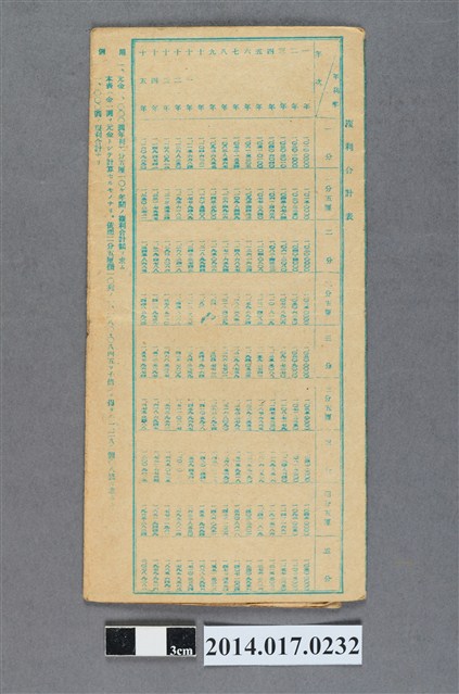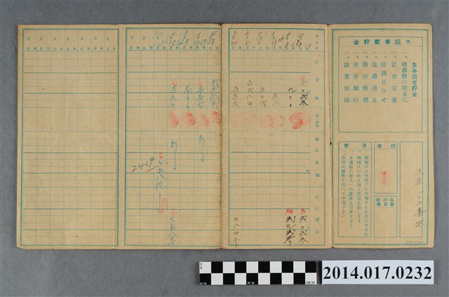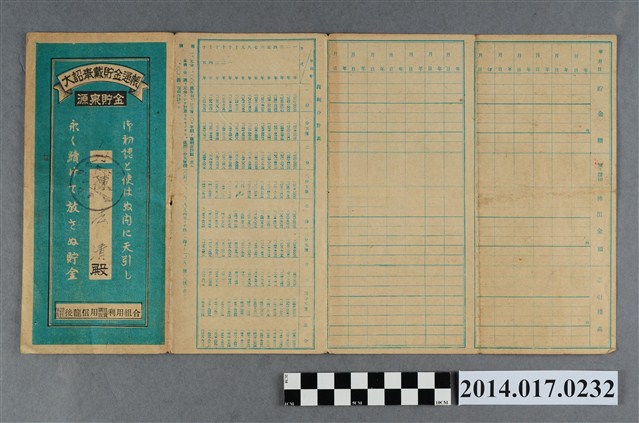 地址載為大庄103。本物件為戰爭期間1943年~1945年期間後龍、公司寮、水尾子、二張犁、大山腳、頭湖、崎頂等地人民之銷帳儲金簿,內頁印有大詔奉戴字樣,並以婚葬儀式簡化、宴會遠慮、新謁見合せ、虛禮廢止、節酒節煙、徒步勵行、副業勉強倡導儲金,另外印有儲簿規定如:不許轉讓、改印需申請等,背頁附有複利合計表。大詔指的是1941年對美、英兩國之宣戰詔書,1942年起每個月8日定為大詔奉戴日,為日本政府為太平洋戰爭所運作的國民運動,隨著戰爭規模擴大,戰時有各項國民強迫儲蓄的舉措,以支援前線戰事,1938年日本政府為因應中日戰爭即推行有愛國儲蓄運動,本物件則為1942年後因應戰爭規模擴大後之儲蓄項目,范雅鈞指出本儲金簿為強制存款,直接由薪資扣除。