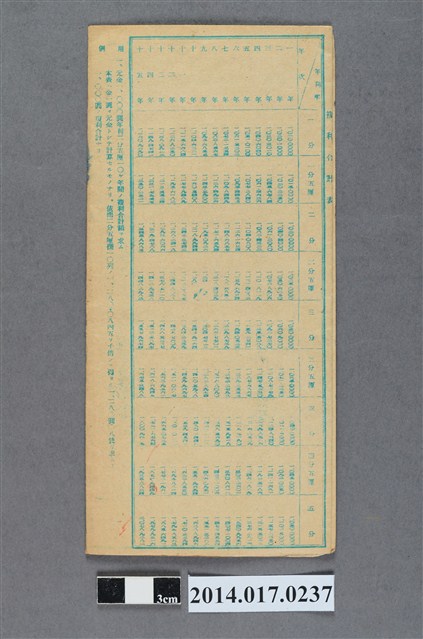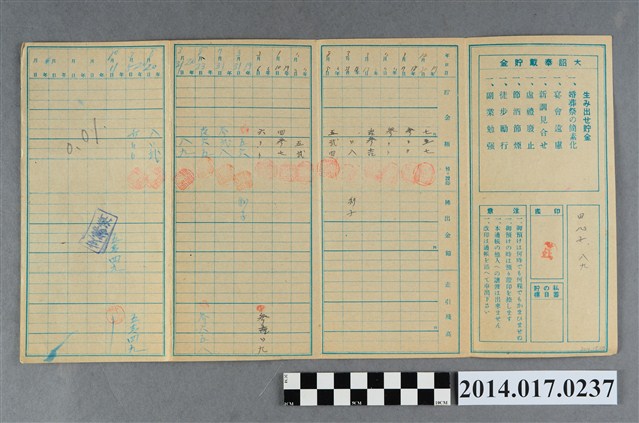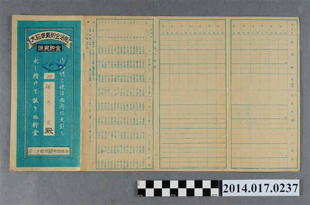 地址載為田心子89。本物件為戰爭期間1943年~1945年期間後龍、公司寮、水尾子、二張犁、大山腳、頭湖、崎頂等地人民之銷帳儲金簿,內頁印有大詔奉戴字樣,並以婚葬儀式簡化、宴會遠慮、新謁見合せ、虛禮廢止、節酒節煙、徒步勵行、副業勉強倡導儲金,另外印有儲簿規定如:不許轉讓、改印需申請等,背頁附有複利合計表。大詔指的是1941年對美、英兩國之宣戰詔書,1942年起每個月8日定為大詔奉戴日,為日本政府為太平洋戰爭所運作的國民運動,隨著戰爭規模擴大,戰時有各項國民強迫儲蓄的舉措,以支援前線戰事,1938年日本政府為因應中日戰爭即推行有愛國儲蓄運動,本物件則為1942年後因應戰爭規模擴大後之儲蓄項目,范雅鈞指出本儲金簿為強制存款,直接由薪資扣除。