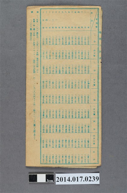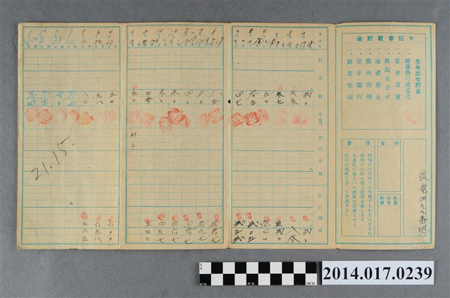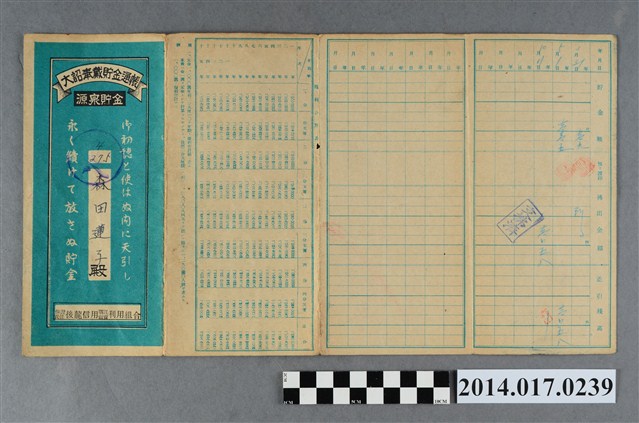 地址載為後龍499番地。本物件為戰爭期間1943年~1945年期間後龍、公司寮、水尾子、二張犁、大山腳、頭湖、崎頂等地人民之銷帳儲金簿,內頁印有大詔奉戴字樣,並以婚葬儀式簡化、宴會遠慮、新謁見合せ、虛禮廢止、節酒節煙、徒步勵行、副業勉強倡導儲金,另外印有儲簿規定如:不許轉讓、改印需申請等,背頁附有複利合計表。大詔指的是1941年對美、英兩國之宣戰詔書,1942年起每個月8日定為大詔奉戴日,為日本政府為太平洋戰爭所運作的國民運動,隨著戰爭規模擴大,戰時有各項國民強迫儲蓄的舉措,以支援前線戰事,1938年日本政府為因應中日戰爭即推行有愛國儲蓄運動,本物件則為1942年後因應戰爭規模擴大後之儲蓄項目,范雅鈞指出本儲金簿為強制存款,直接由薪資扣除。