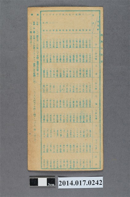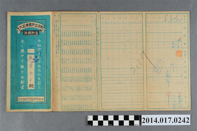 地址載為後龍144。本物件為戰爭期間1943年~1945年期間後龍、公司寮、水尾子、二張犁、大山腳、頭湖、崎頂等地人民之銷帳儲金簿,內頁印有大詔奉戴字樣,並以婚葬儀式簡化、宴會遠慮、新謁見合せ、虛禮廢止、節酒節煙、徒步勵行、副業勉強倡導儲金,另外印有儲簿規定如:不許轉讓、改印需申請等,背頁附有複利合計表。大詔指的是1941年對美、英兩國之宣戰詔書,1942年起每個月8日定為大詔奉戴日,為日本政府為太平洋戰爭所運作的國民運動,隨著戰爭規模擴大,戰時有各項國民強迫儲蓄的舉措,以支援前線戰事,1938年日本政府為因應中日戰爭即推行有愛國儲蓄運動,本物件則為1942年後因應戰爭規模擴大後之儲蓄項目,范雅鈞指出本儲金簿為強制存款,直接由薪資扣除。