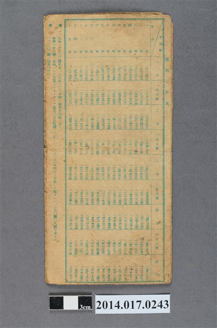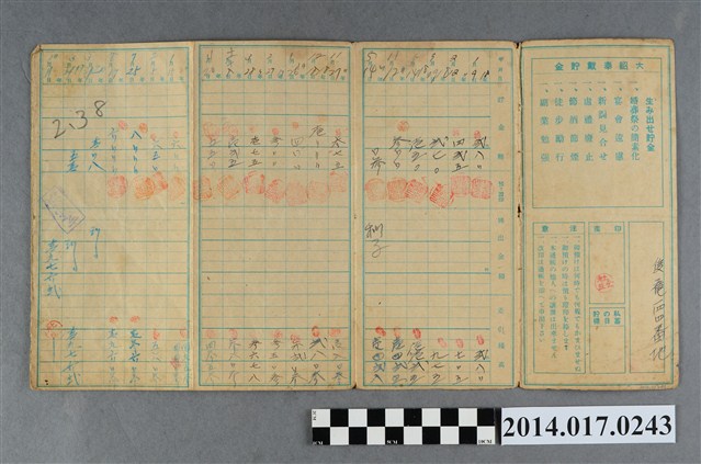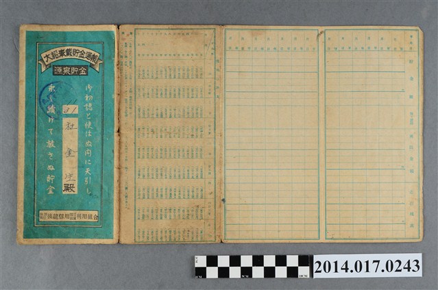 地址載為後龍144番地。本物件為戰爭期間1943年~1945年期間後龍、公司寮、水尾子、二張犁、大山腳、頭湖、崎頂等地人民之銷帳儲金簿,內頁印有大詔奉戴字樣,並以婚葬儀式簡化、宴會遠慮、新謁見合せ、虛禮廢止、節酒節煙、徒步勵行、副業勉強倡導儲金,另外印有儲簿規定如:不許轉讓、改印需申請等,背頁附有複利合計表。大詔指的是1941年對美、英兩國之宣戰詔書,1942年起每個月8日定為大詔奉戴日,為日本政府為太平洋戰爭所運作的國民運動,隨著戰爭規模擴大,戰時有各項國民強迫儲蓄的舉措,以支援前線戰事,1938年日本政府為因應中日戰爭即推行有愛國儲蓄運動,本物件則為1942年後因應戰爭規模擴大後之儲蓄項目,范雅鈞指出本儲金簿為強制存款,直接由薪資扣除。