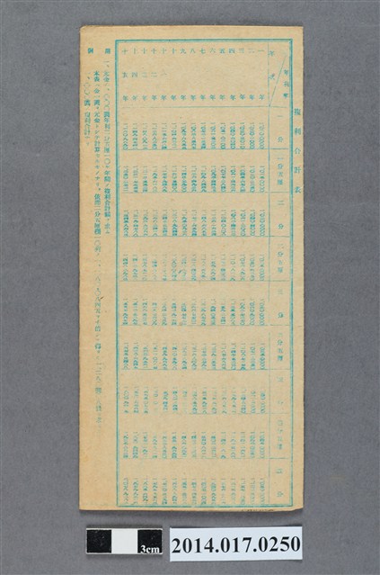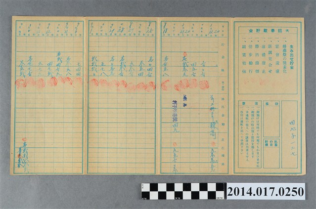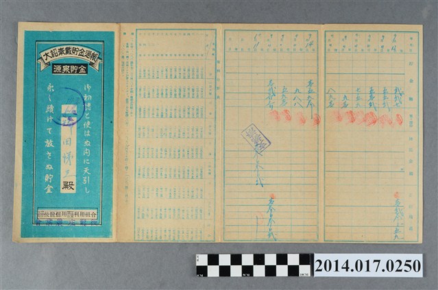 地址載為田心子127。本物件為戰爭期間1943年~1945年期間後龍、公司寮、水尾子、二張犁、大山腳、頭湖、崎頂等地人民之銷帳儲金簿,內頁印有大詔奉戴字樣,並以婚葬儀式簡化、宴會遠慮、新謁見合せ、虛禮廢止、節酒節煙、徒步勵行、副業勉強倡導儲金,另外印有儲簿規定如:不許轉讓、改印需申請等,背頁附有複利合計表。大詔指的是1941年對美、英兩國之宣戰詔書,1942年起每個月8日定為大詔奉戴日,為日本政府為太平洋戰爭所運作的國民運動,隨著戰爭規模擴大,戰時有各項國民強迫儲蓄的舉措,以支援前線戰事,1938年日本政府為因應中日戰爭即推行有愛國儲蓄運動,本物件則為1942年後因應戰爭規模擴大後之儲蓄項目,范雅鈞指出本儲金簿為強制存款,直接由薪資扣除。