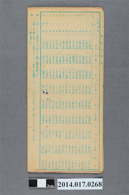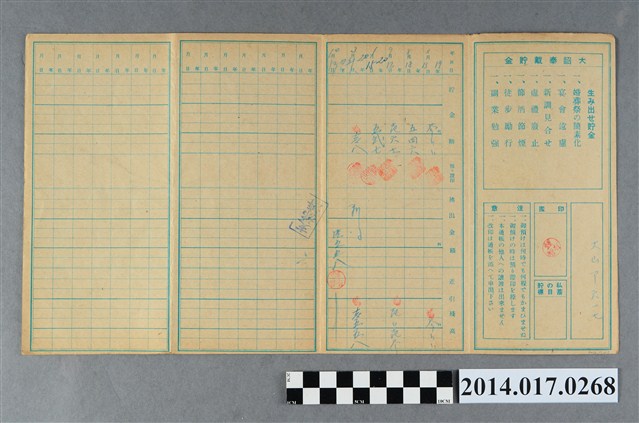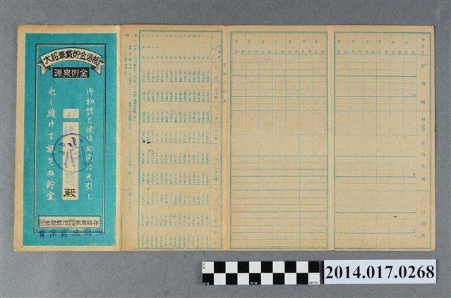 地址載為大山ア617。本物件為戰爭期間1943年~1945年期間後龍、公司寮、水尾子、二張犁、大山腳、頭湖、崎頂等地人民之銷帳儲金簿,內頁印有大詔奉戴字樣,並以婚葬儀式簡化、宴會遠慮、新謁見合せ、虛禮廢止、節酒節煙、徒步勵行、副業勉強倡導儲金,另外印有儲簿規定如:不許轉讓、改印需申請等,背頁附有複利合計表。大詔指的是1941年對美、英兩國之宣戰詔書,1942年起每個月8日定為大詔奉戴日,為日本政府為太平洋戰爭所運作的國民運動,隨著戰爭規模擴大,戰時有各項國民強迫儲蓄的舉措,以支援前線戰事,1938年日本政府為因應中日戰爭即推行有愛國儲蓄運動,本物件則為1942年後因應戰爭規模擴大後之儲蓄項目,范雅鈞指出本儲金簿為強制存款,直接由薪資扣除。