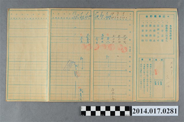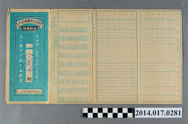 地址載為大山ア617番地。本物件為戰爭期間1943年~1945年期間後龍、公司寮、水尾子、二張犁、大山腳、頭湖、崎頂等地人民之銷帳儲金簿,內頁印有大詔奉戴字樣,並以婚葬儀式簡化、宴會遠慮、新謁見合せ、虛禮廢止、節酒節煙、徒步勵行、副業勉強倡導儲金,另外印有儲簿規定如:不許轉讓、改印需申請等,背頁附有複利合計表。大詔指的是1941年對美、英兩國之宣戰詔書,1942年起每個月8日定為大詔奉戴日,為日本政府為太平洋戰爭所運作的國民運動,隨著戰爭規模擴大,戰時有各項國民強迫儲蓄的舉措,以支援前線戰事,1938年日本政府為因應中日戰爭即推行有愛國儲蓄運動,本物件則為1942年後因應戰爭規模擴大後之儲蓄項目,范雅鈞指出本儲金簿為強制存款,直接由薪資扣除。
