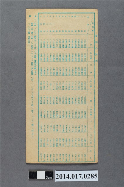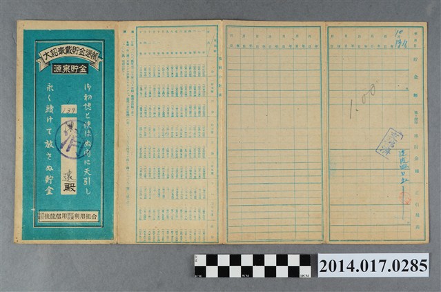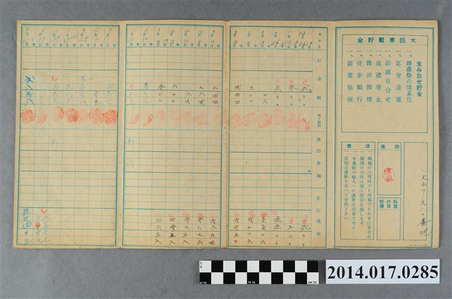地址載為大山ア680番地。本物件為戰爭期間1943年~1945年期間後龍、公司寮、水尾子、二張犁、大山腳、頭湖、崎頂等地人民之銷帳儲金簿,內頁印有大詔奉戴字樣,並以婚葬儀式簡化、宴會遠慮、新謁見合せ、虛禮廢止、節酒節煙、徒步勵行、副業勉強倡導儲金,另外印有儲簿規定如:不許轉讓、改印需申請等,背頁附有複利合計表。大詔指的是1941年對美、英兩國之宣戰詔書,1942年起每個月8日定為大詔奉戴日,為日本政府為太平洋戰爭所運作的國民運動,隨著戰爭規模擴大,戰時有各項國民強迫儲蓄的舉措,以支援前線戰事,1938年日本政府為因應中日戰爭即推行有愛國儲蓄運動,本物件則為1942年後因應戰爭規模擴大後之儲蓄項目,范雅鈞指出本儲金簿為強制存款,直接由薪資扣除。