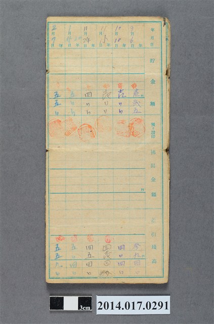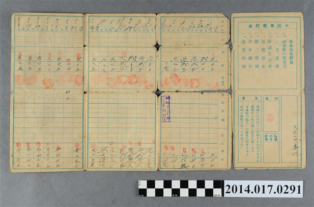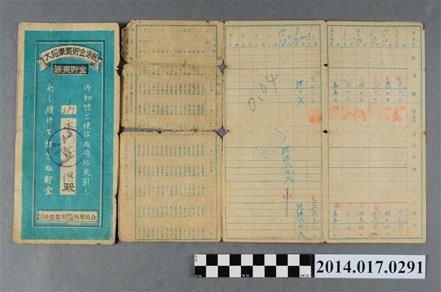 地址載為大庄241番地。本物件為戰爭期間1943年~1945年期間後龍、公司寮、水尾子、二張犁、大山腳、頭湖、崎頂等地人民之銷帳儲金簿,內頁印有大詔奉戴字樣,並以婚葬儀式簡化、宴會遠慮、新謁見合せ、虛禮廢止、節酒節煙、徒步勵行、副業勉強倡導儲金,另外印有儲簿規定如:不許轉讓、改印需申請等,背頁附有複利合計表。大詔指的是1941年對美、英兩國之宣戰詔書,1942年起每個月8日定為大詔奉戴日,為日本政府為太平洋戰爭所運作的國民運動,隨著戰爭規模擴大,戰時有各項國民強迫儲蓄的舉措,以支援前線戰事,1938年日本政府為因應中日戰爭即推行有愛國儲蓄運動,本物件則為1942年後因應戰爭規模擴大後之儲蓄項目,范雅鈞指出本儲金簿為強制存款,直接由薪資扣除。