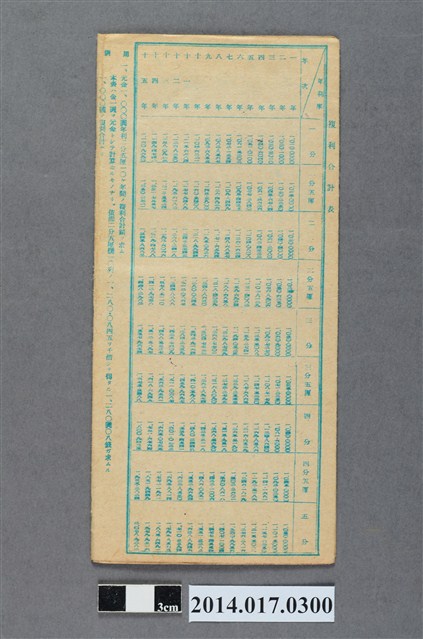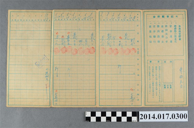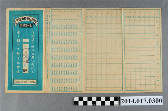 地址載為東西55。本物件為戰爭期間1943年~1945年期間後龍、公司寮、水尾子、二張犁、大山腳、頭湖、崎頂等地人民之銷帳儲金簿,內頁印有大詔奉戴字樣,並以婚葬儀式簡化、宴會遠慮、新謁見合せ、虛禮廢止、節酒節煙、徒步勵行、副業勉強倡導儲金,另外印有儲簿規定如:不許轉讓、改印需申請等,背頁附有複利合計表。大詔指的是1941年對美、英兩國之宣戰詔書,1942年起每個月8日定為大詔奉戴日,為日本政府為太平洋戰爭所運作的國民運動,隨著戰爭規模擴大,戰時有各項國民強迫儲蓄的舉措,以支援前線戰事,1938年日本政府為因應中日戰爭即推行有愛國儲蓄運動,本物件則為1942年後因應戰爭規模擴大後之儲蓄項目,范雅鈞指出本儲金簿為強制存款,直接由薪資扣除。