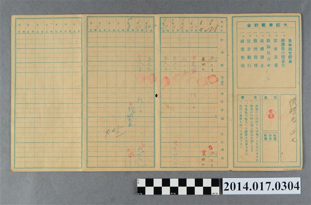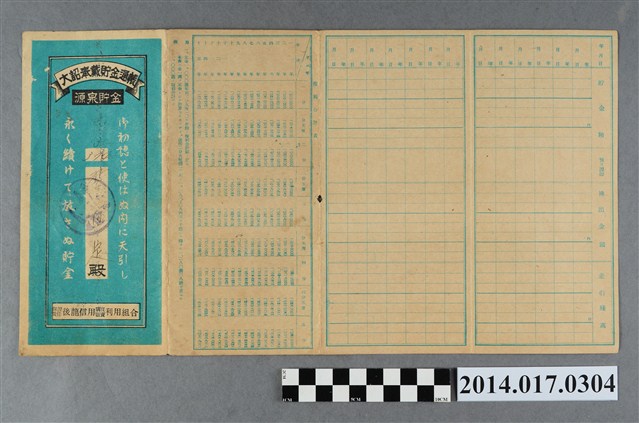 地址載為後壁厝47。本物件為戰爭期間1943年~1945年期間後龍、公司寮、水尾子、二張犁、大山腳、頭湖、崎頂等地人民之銷帳儲金簿,內頁印有大詔奉戴字樣,並以婚葬儀式簡化、宴會遠慮、新謁見合せ、虛禮廢止、節酒節煙、徒步勵行、副業勉強倡導儲金,另外印有儲簿規定如:不許轉讓、改印需申請等,背頁附有複利合計表。大詔指的是1941年對美、英兩國之宣戰詔書,1942年起每個月8日定為大詔奉戴日,為日本政府為太平洋戰爭所運作的國民運動,隨著戰爭規模擴大,戰時有各項國民強迫儲蓄的舉措,以支援前線戰事,1938年日本政府為因應中日戰爭即推行有愛國儲蓄運動,本物件則為1942年後因應戰爭規模擴大後之儲蓄項目,范雅鈞指出本儲金簿為強制存款,直接由薪資扣除。