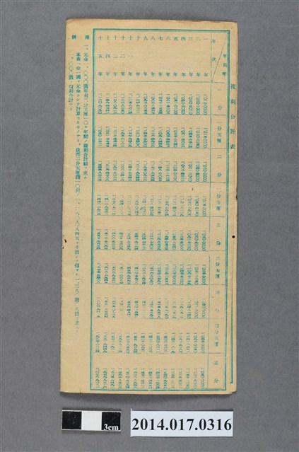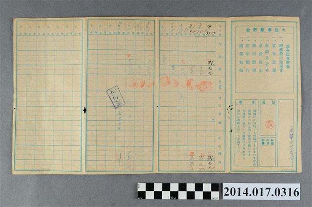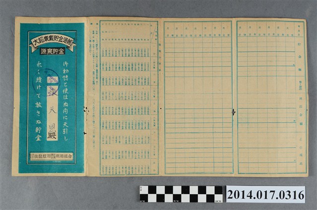 地址登載為二張犁442。本物件為戰爭期間1943年~1945年期間後龍、公司寮、水尾子、二張犁、大山腳、頭湖、崎頂等地人民之銷帳儲金簿,內頁印有大詔奉戴字樣,並以婚葬儀式簡化、宴會遠慮、新謁見合せ、虛禮廢止、節酒節煙、徒步勵行、副業勉強倡導儲金,另外印有儲簿規定如:不許轉讓、改印需申請等,背頁附有複利合計表。大詔指的是1941年對美、英兩國之宣戰詔書,1942年起每個月8日定為大詔奉戴日,為日本政府為太平洋戰爭所運作的國民運動,隨著戰爭規模擴大,戰時有各項國民強迫儲蓄的舉措,以支援前線戰事,1938年日本政府為因應中日戰爭即推行有愛國儲蓄運動,本物件則為1942年後因應戰爭規模擴大後之儲蓄項目,范雅鈞指出本儲金簿為強制存款,直接由薪資扣除。