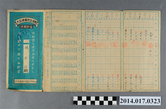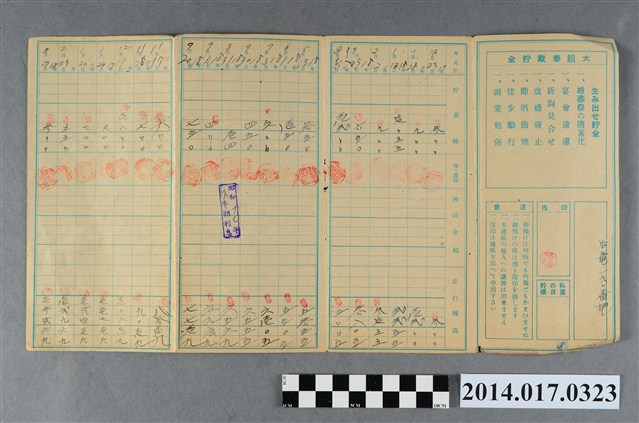 地址載為後龍160。本物件為戰爭期間1943年~1945年期間後龍、公司寮、水尾子、二張犁、大山腳、頭湖、崎頂等地人民之銷帳儲金簿,內頁印有大詔奉戴字樣,並以婚葬儀式簡化、宴會遠慮、新謁見合せ、虛禮廢止、節酒節煙、徒步勵行、副業勉強倡導儲金,另外印有儲簿規定如:不許轉讓、改印需申請等,背頁附有複利合計表。大詔指的是1941年對美、英兩國之宣戰詔書,1942年起每個月8日定為大詔奉戴日,為日本政府為太平洋戰爭所運作的國民運動,隨著戰爭規模擴大,戰時有各項國民強迫儲蓄的舉措,以支援前線戰事,1938年日本政府為因應中日戰爭即推行有愛國儲蓄運動,本物件則為1942年後因應戰爭規模擴大後之儲蓄項目,范雅鈞指出本儲金簿為強制存款,直接由薪資扣除。