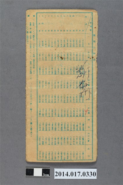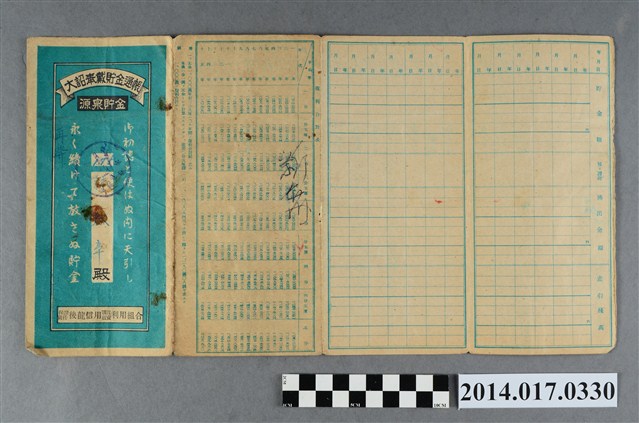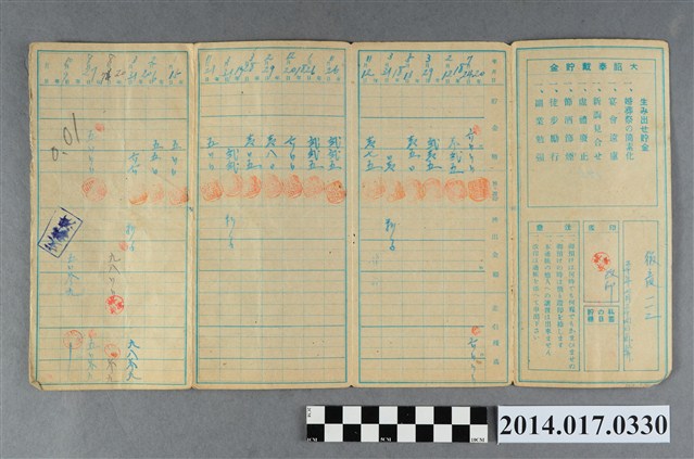 地址載為後龍112。本物件為戰爭期間1943年~1945年期間後龍、公司寮、水尾子、二張犁、大山腳、頭湖、崎頂等地人民之銷帳儲金簿,內頁印有大詔奉戴字樣,並以婚葬儀式簡化、宴會遠慮、新謁見合せ、虛禮廢止、節酒節煙、徒步勵行、副業勉強倡導儲金,另外印有儲簿規定如:不許轉讓、改印需申請等,背頁附有複利合計表。大詔指的是1941年對美、英兩國之宣戰詔書,1942年起每個月8日定為大詔奉戴日,為日本政府為太平洋戰爭所運作的國民運動,隨著戰爭規模擴大,戰時有各項國民強迫儲蓄的舉措,以支援前線戰事,1938年日本政府為因應中日戰爭即推行有愛國儲蓄運動,本物件則為1942年後因應戰爭規模擴大後之儲蓄項目,范雅鈞指出本儲金簿為強制存款,直接由薪資扣除。