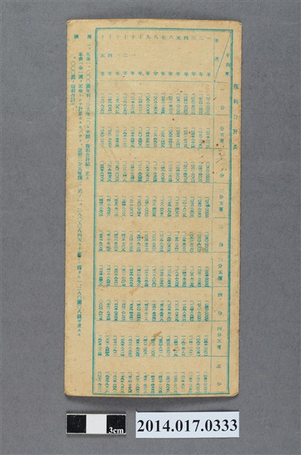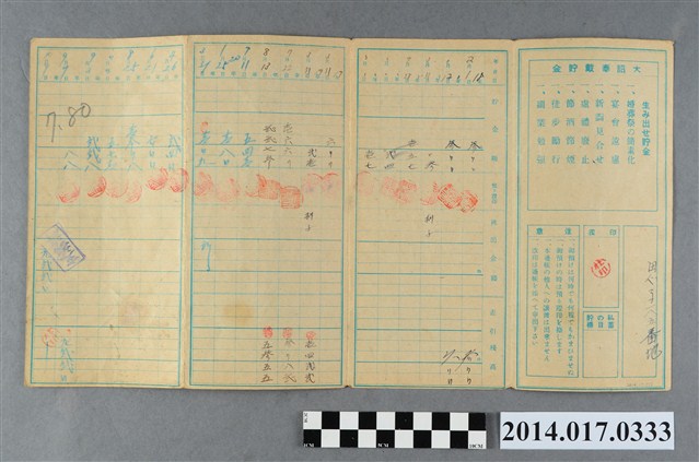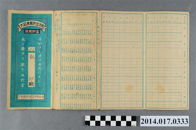 地址載為田心子185番地。本物件為戰爭期間1943年~1945年期間後龍、公司寮、水尾子、二張犁、大山腳、頭湖、崎頂等地人民之銷帳儲金簿,內頁印有大詔奉戴字樣,並以婚葬儀式簡化、宴會遠慮、新謁見合せ、虛禮廢止、節酒節煙、徒步勵行、副業勉強倡導儲金,另外印有儲簿規定如:不許轉讓、改印需申請等,背頁附有複利合計表。大詔指的是1941年對美、英兩國之宣戰詔書,1942年起每個月8日定為大詔奉戴日,為日本政府為太平洋戰爭所運作的國民運動,隨著戰爭規模擴大,戰時有各項國民強迫儲蓄的舉措,以支援前線戰事,1938年日本政府為因應中日戰爭即推行有愛國儲蓄運動,本物件則為1942年後因應戰爭規模擴大後之儲蓄項目,范雅鈞指出本儲金簿為強制存款,直接由薪資扣除。