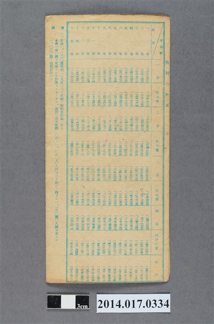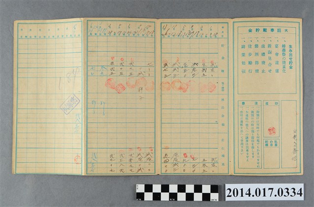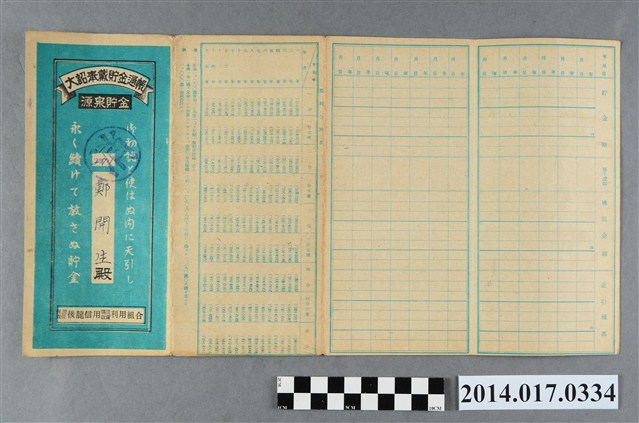 地址載為後龍93番地。本物件為戰爭期間1943年~1945年期間後龍、公司寮、水尾子、二張犁、大山腳、頭湖、崎頂等地人民之銷帳儲金簿,內頁印有大詔奉戴字樣,並以婚葬儀式簡化、宴會遠慮、新謁見合せ、虛禮廢止、節酒節煙、徒步勵行、副業勉強倡導儲金,另外印有儲簿規定如:不許轉讓、改印需申請等,背頁附有複利合計表。大詔指的是1941年對美、英兩國之宣戰詔書,1942年起每個月8日定為大詔奉戴日,為日本政府為太平洋戰爭所運作的國民運動,隨著戰爭規模擴大,戰時有各項國民強迫儲蓄的舉措,以支援前線戰事,1938年日本政府為因應中日戰爭即推行有愛國儲蓄運動,本物件則為1942年後因應戰爭規模擴大後之儲蓄項目,范雅鈞指出本儲金簿為強制存款,直接由薪資扣除。