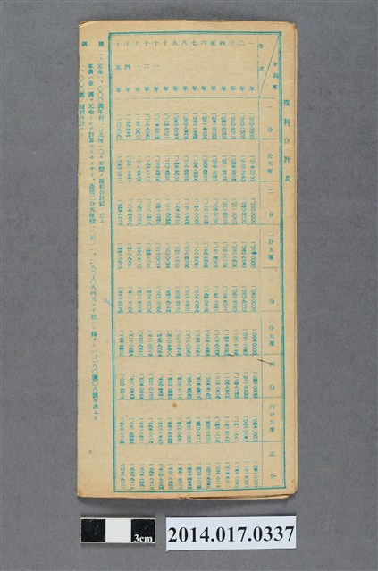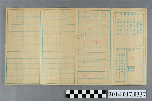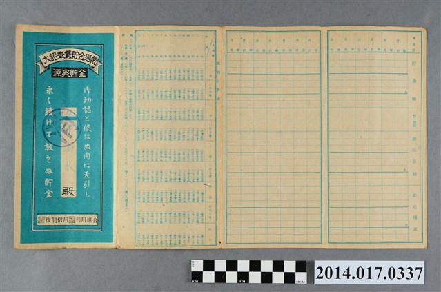 地址載為二張犁441。本物件為戰爭期間1943年~1945年期間後龍、公司寮、水尾子、二張犁、大山腳、頭湖、崎頂等地人民之銷帳儲金簿,內頁印有大詔奉戴字樣,並以婚葬儀式簡化、宴會遠慮、新謁見合せ、虛禮廢止、節酒節煙、徒步勵行、副業勉強倡導儲金,另外印有儲簿規定如:不許轉讓、改印需申請等,背頁附有複利合計表。大詔指的是1941年對美、英兩國之宣戰詔書,1942年起每個月8日定為大詔奉戴日,為日本政府為太平洋戰爭所運作的國民運動,隨著戰爭規模擴大,戰時有各項國民強迫儲蓄的舉措,以支援前線戰事,1938年日本政府為因應中日戰爭即推行有愛國儲蓄運動,本物件則為1942年後因應戰爭規模擴大後之儲蓄項目,范雅鈞指出本儲金簿為強制存款,直接由薪資扣除。