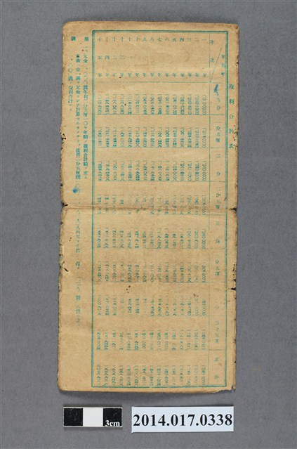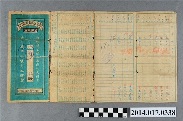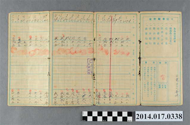 地址載為後龍499番地。本物件為戰爭期間1943年~1945年期間後龍、公司寮、水尾子、二張犁、大山腳、頭湖、崎頂等地人民之銷帳儲金簿,內頁印有大詔奉戴字樣,並以婚葬儀式簡化、宴會遠慮、新謁見合せ、虛禮廢止、節酒節煙、徒步勵行、副業勉強倡導儲金,另外印有儲簿規定如:不許轉讓、改印需申請等,背頁附有複利合計表。大詔指的是1941年對美、英兩國之宣戰詔書,1942年起每個月8日定為大詔奉戴日,為日本政府為太平洋戰爭所運作的國民運動,隨著戰爭規模擴大,戰時有各項國民強迫儲蓄的舉措,以支援前線戰事,1938年日本政府為因應中日戰爭即推行有愛國儲蓄運動,本物件則為1942年後因應戰爭規模擴大後之儲蓄項目,范雅鈞指出本儲金簿為強制存款,直接由薪資扣除。