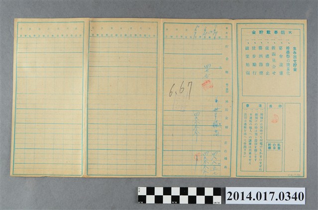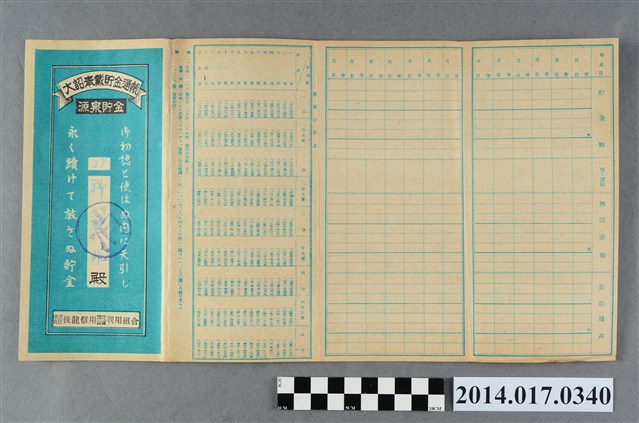 本物件為戰爭期間1943年~1945年期間後龍、公司寮、水尾子、二張犁、大山腳、頭湖、崎頂等地人民之銷帳儲金簿,內頁印有大詔奉戴字樣,並以婚葬儀式簡化、宴會遠慮、新謁見合せ、虛禮廢止、節酒節煙、徒步勵行、副業勉強倡導儲金,另外印有儲簿規定如:不許轉讓、改印需申請等,背頁附有複利合計表。大詔指的是1941年對美、英兩國之宣戰詔書,1942年起每個月8日定為大詔奉戴日,為日本政府為太平洋戰爭所運作的國民運動,隨著戰爭規模擴大,戰時有各項國民強迫儲蓄的舉措,以支援前線戰事,1938年日本政府為因應中日戰爭即推行有愛國儲蓄運動,本物件則為1942年後因應戰爭規模擴大後之儲蓄項目,范雅鈞指出本儲金簿為強制存款,直接由薪資扣除。