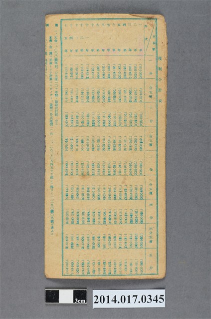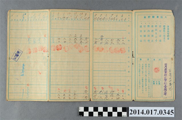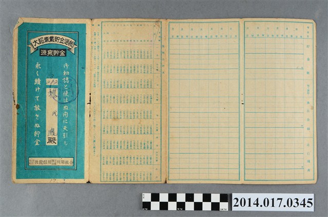 地址載為後龍44番地。本物件為戰爭期間1943年~1945年期間後龍、公司寮、水尾子、二張犁、大山腳、頭湖、崎頂等地人民之銷帳儲金簿,內頁印有大詔奉戴字樣,並以婚葬儀式簡化、宴會遠慮、新謁見合せ、虛禮廢止、節酒節煙、徒步勵行、副業勉強倡導儲金,另外印有儲簿規定如:不許轉讓、改印需申請等,背頁附有複利合計表。大詔指的是1941年對美、英兩國之宣戰詔書,1942年起每個月8日定為大詔奉戴日,為日本政府為太平洋戰爭所運作的國民運動,隨著戰爭規模擴大,戰時有各項國民強迫儲蓄的舉措,以支援前線戰事,1938年日本政府為因應中日戰爭即推行有愛國儲蓄運動,本物件則為1942年後因應戰爭規模擴大後之儲蓄項目,范雅鈞指出本儲金簿為強制存款,直接由薪資扣除。