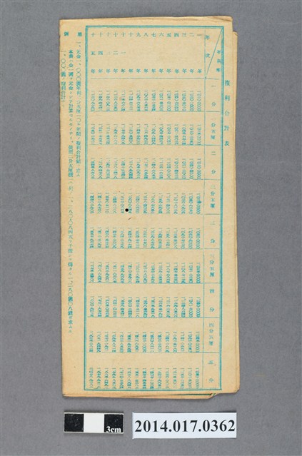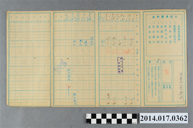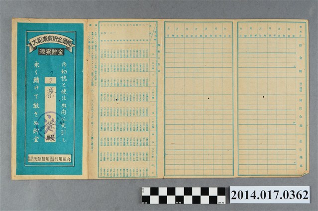 地址載為後龍底349番地。本物件為戰爭期間1943年~1945年期間後龍、公司寮、水尾子、二張犁、大山腳、頭湖、崎頂等地人民之銷帳儲金簿,內頁印有大詔奉戴字樣,並以婚葬儀式簡化、宴會遠慮、新謁見合せ、虛禮廢止、節酒節煙、徒步勵行、副業勉強倡導儲金,另外印有儲簿規定如:不許轉讓、改印需申請等,背頁附有複利合計表。大詔指的是1941年對美、英兩國之宣戰詔書,1942年起每個月8日定為大詔奉戴日,為日本政府為太平洋戰爭所運作的國民運動,隨著戰爭規模擴大,戰時有各項國民強迫儲蓄的舉措,以支援前線戰事,1938年日本政府為因應中日戰爭即推行有愛國儲蓄運動,本物件則為1942年後因應戰爭規模擴大後之儲蓄項目,范雅鈞指出本儲金簿為強制存款,直接由薪資扣除。