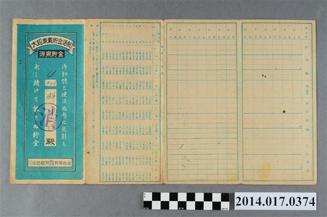 地址處載有十班坑279及大庄18番地。本物件為戰爭期間1943年~1945年期間後龍、公司寮、水尾子、二張犁、大山腳、頭湖、崎頂等地人民之銷帳儲金簿,內頁印有大詔奉戴字樣,並以婚葬儀式簡化、宴會遠慮、新謁見合せ、虛禮廢止、節酒節煙、徒步勵行、副業勉強倡導儲金,另外印有儲簿規定如:不許轉讓、改印需申請等,背頁附有複利合計表。大詔指的是1941年對美、英兩國之宣戰詔書,1942年起每個月8日定為大詔奉戴日,為日本政府為太平洋戰爭所運作的國民運動,隨著戰爭規模擴大,戰時有各項國民強迫儲蓄的舉措,以支援前線戰事,1938年日本政府為因應中日戰爭即推行有愛國儲蓄運動,本物件則為1942年後因應戰爭規模擴大後之儲蓄項目,范雅鈞指出本儲金簿為強制存款,直接由薪資扣除。