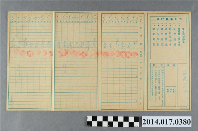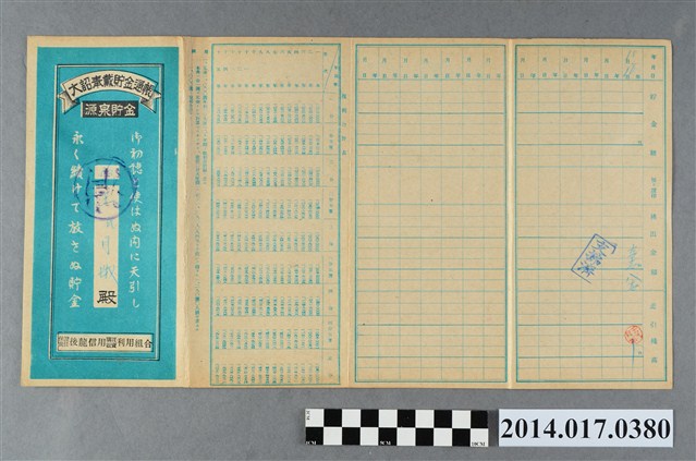 地址處載有後龍179。本物件為戰爭期間1943年~1945年期間後龍、公司寮、水尾子、二張犁、大山腳、頭湖、崎頂等地人民之銷帳儲金簿,內頁印有大詔奉戴字樣,並以婚葬儀式簡化、宴會遠慮、新謁見合せ、虛禮廢止、節酒節煙、徒步勵行、副業勉強倡導儲金,另外印有儲簿規定如:不許轉讓、改印需申請等,背頁附有複利合計表。大詔指的是1941年對美、英兩國之宣戰詔書,1942年起每個月8日定為大詔奉戴日,為日本政府為太平洋戰爭所運作的國民運動,隨著戰爭規模擴大,戰時有各項國民強迫儲蓄的舉措,以支援前線戰事,1938年日本政府為因應中日戰爭即推行有愛國儲蓄運動,本物件則為1942年後因應戰爭規模擴大後之儲蓄項目,范雅鈞指出本儲金簿為強制存款,直接由薪資扣除。