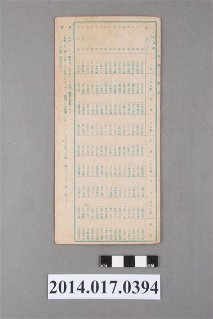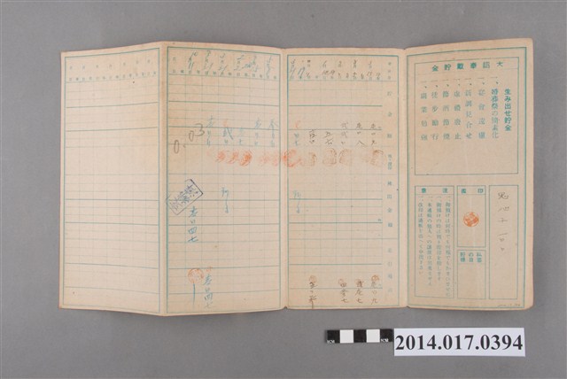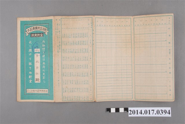 地址載有田心子100。本物件為戰爭期間1943年~1945年期間後龍、公司寮、水尾子、二張犁、大山腳、頭湖、崎頂等地人民之銷帳儲金簿,內頁印有大詔奉戴字樣,並以婚葬儀式簡化、宴會遠慮、新謁見合せ、虛禮廢止、節酒節煙、徒步勵行、副業勉強倡導儲金,另外印有儲簿規定如:不許轉讓、改印需申請等,背頁附有複利合計表。大詔指的是1941年對美、英兩國之宣戰詔書,1942年起每個月8日定為大詔奉戴日,為日本政府為太平洋戰爭所運作的國民運動,隨著戰爭規模擴大,戰時有各項國民強迫儲蓄的舉措,以支援前線戰事,1938年日本政府為因應中日戰爭即推行有愛國儲蓄運動,本物件則為1942年後因應戰爭規模擴大後之儲蓄項目,范雅鈞指出本儲金簿為強制存款,直接由薪資扣除。