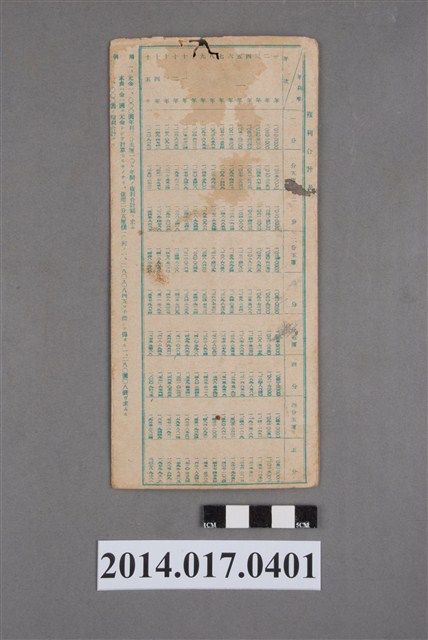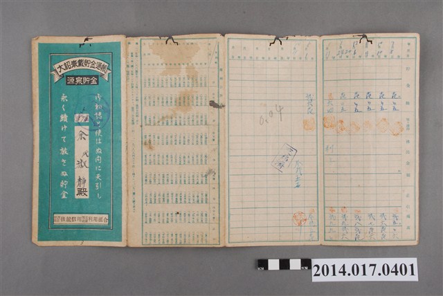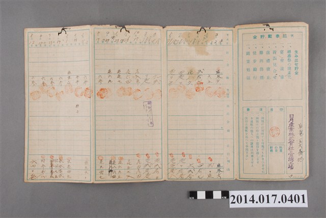 印有日月產業株式會社臺灣工廠印,地址載為後龍156番地。本物件為戰爭期間1943年~1945年期間後龍、公司寮、水尾子、二張犁、大山腳、頭湖、崎頂等地人民之銷帳儲金簿,內頁印有大詔奉戴字樣,並以婚葬儀式簡化、宴會遠慮、新謁見合せ、虛禮廢止、節酒節煙、徒步勵行、副業勉強倡導儲金,另外印有儲簿規定如:不許轉讓、改印需申請等,背頁附有複利合計表。大詔指的是1941年對美、英兩國之宣戰詔書,1942年起每個月8日定為大詔奉戴日,為日本政府為太平洋戰爭所運作的國民運動,隨著戰爭規模擴大,戰時有各項國民強迫儲蓄的舉措,以支援前線戰事,1938年日本政府為因應中日戰爭即推行有愛國儲蓄運動,本物件則為1942年後因應戰爭規模擴大後之儲蓄項目,范雅鈞指出本儲金簿為強制存款,直接由薪資扣除。
