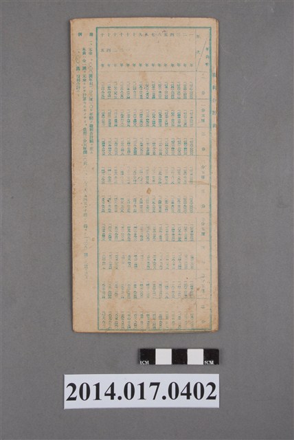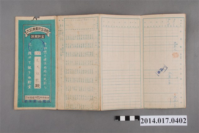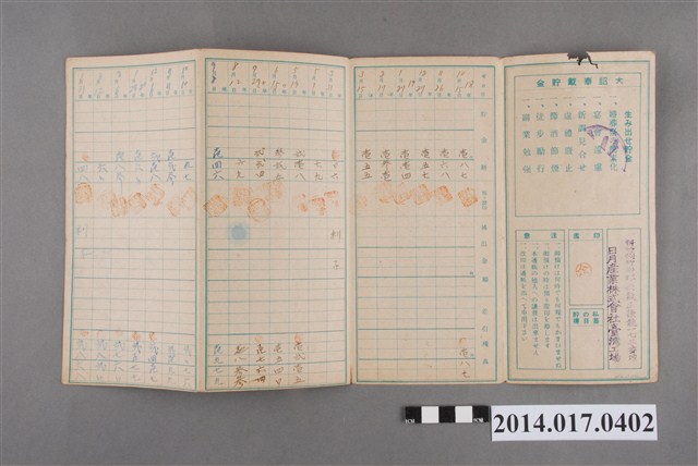 地址處引有日月產業株式會社臺灣工廠及新竹州竹南郡後龍庄後龍173番地。本物件為戰爭期間1943年~1945年期間後龍、公司寮、水尾子、二張犁、大山腳、頭湖、崎頂等地人民之銷帳儲金簿,內頁印有大詔奉戴字樣,並以婚葬儀式簡化、宴會遠慮、新謁見合せ、虛禮廢止、節酒節煙、徒步勵行、副業勉強倡導儲金,另外印有儲簿規定如:不許轉讓、改印需申請等,背頁附有複利合計表。大詔指的是1941年對美、英兩國之宣戰詔書,1942年起每個月8日定為大詔奉戴日,為日本政府為太平洋戰爭所運作的國民運動,隨著戰爭規模擴大,戰時有各項國民強迫儲蓄的舉措,以支援前線戰事,1938年日本政府為因應中日戰爭即推行有愛國儲蓄運動,本物件則為1942年後因應戰爭規模擴大後之儲蓄項目,范雅鈞指出本儲金簿為強制存款,直接由薪資扣除。