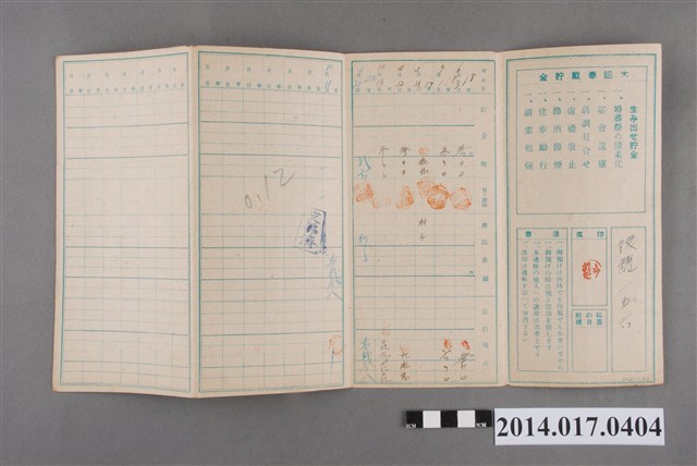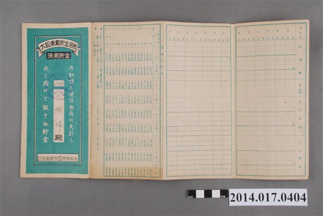 地址處載有後龍156。本物件為戰爭期間1943年~1945年期間後龍、公司寮、水尾子、二張犁、大山腳、頭湖、崎頂等地人民之銷帳儲金簿,內頁印有大詔奉戴字樣,並以婚葬儀式簡化、宴會遠慮、新謁見合せ、虛禮廢止、節酒節煙、徒步勵行、副業勉強倡導儲金,另外印有儲簿規定如:不許轉讓、改印需申請等,背頁附有複利合計表。大詔指的是1941年對美、英兩國之宣戰詔書,1942年起每個月8日定為大詔奉戴日,為日本政府為太平洋戰爭所運作的國民運動,隨著戰爭規模擴大,戰時有各項國民強迫儲蓄的舉措,以支援前線戰事,1938年日本政府為因應中日戰爭即推行有愛國儲蓄運動,本物件則為1942年後因應戰爭規模擴大後之儲蓄項目,范雅鈞指出本儲金簿為強制存款,直接由薪資扣除。