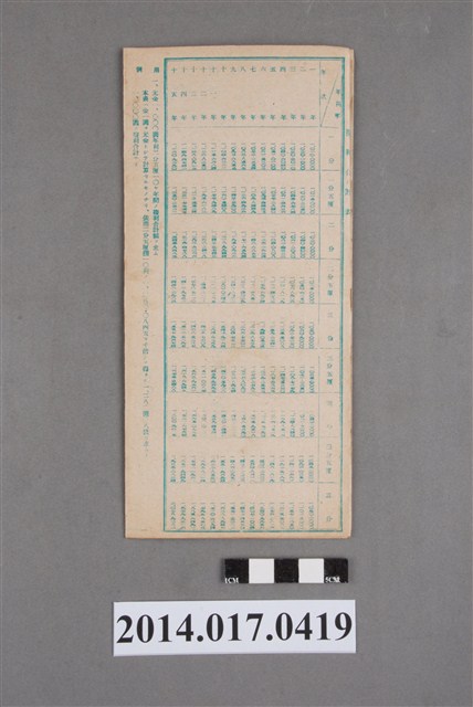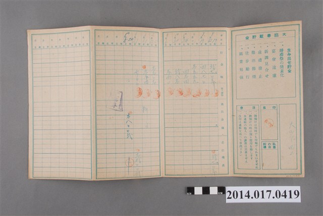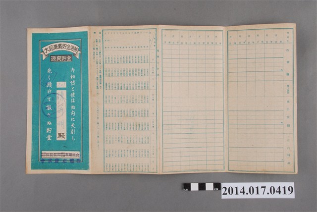 地址處載有大山ア42。本物件為戰爭期間1943年~1945年期間後龍、公司寮、水尾子、二張犁、大山腳、頭湖、崎頂等地人民之銷帳儲金簿,內頁印有大詔奉戴字樣,並以婚葬儀式簡化、宴會遠慮、新謁見合せ、虛禮廢止、節酒節煙、徒步勵行、副業勉強倡導儲金,另外印有儲簿規定如:不許轉讓、改印需申請等,背頁附有複利合計表。大詔指的是1941年對美、英兩國之宣戰詔書,1942年起每個月8日定為大詔奉戴日,為日本政府為太平洋戰爭所運作的國民運動,隨著戰爭規模擴大,戰時有各項國民強迫儲蓄的舉措,以支援前線戰事,1938年日本政府為因應中日戰爭即推行有愛國儲蓄運動,本物件則為1942年後因應戰爭規模擴大後之儲蓄項目,范雅鈞指出本儲金簿為強制存款,直接由薪資扣除。