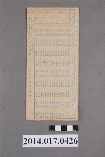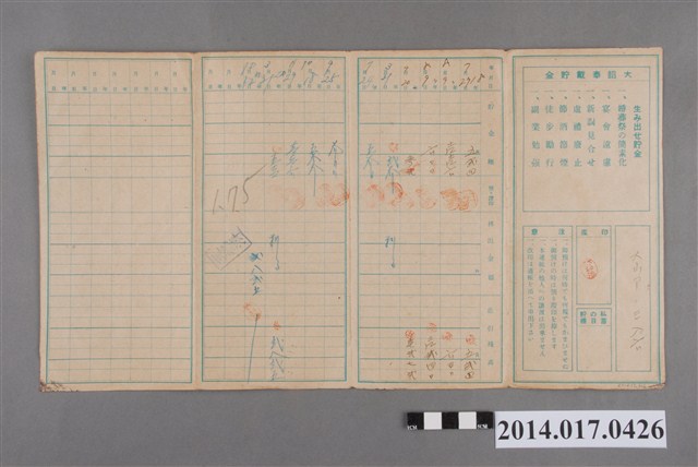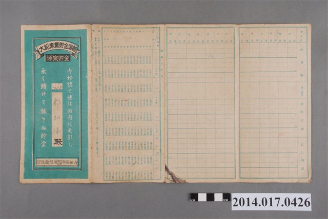 地址登載為大山ア386。本物件為戰爭期間1943年~1945年期間後龍、公司寮、水尾子、二張犁、大山腳、頭湖、崎頂等地人民之銷帳儲金簿,內頁印有大詔奉戴字樣,並以婚葬儀式簡化、宴會遠慮、新謁見合せ、虛禮廢止、節酒節煙、徒步勵行、副業勉強倡導儲金,另外印有儲簿規定如:不許轉讓、改印需申請等,背頁附有複利合計表。大詔指的是1941年對美、英兩國之宣戰詔書,1942年起每個月8日定為大詔奉戴日,為日本政府為太平洋戰爭所運作的國民運動,隨著戰爭規模擴大,戰時有各項國民強迫儲蓄的舉措,以支援前線戰事,1938年日本政府為因應中日戰爭即推行有愛國儲蓄運動,本物件則為1942年後因應戰爭規模擴大後之儲蓄項目,范雅鈞指出本儲金簿為強制存款,直接由薪資扣除。