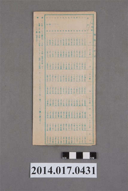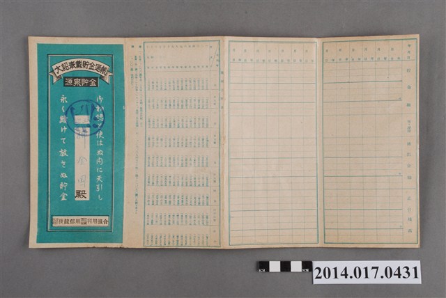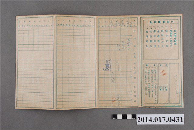 地址登載為大庄325。本物件為戰爭期間1943年~1945年期間後龍、公司寮、水尾子、二張犁、大山腳、頭湖、崎頂等地人民之銷帳儲金簿,內頁印有大詔奉戴字樣,並以婚葬儀式簡化、宴會遠慮、新謁見合せ、虛禮廢止、節酒節煙、徒步勵行、副業勉強倡導儲金,另外印有儲簿規定如:不許轉讓、改印需申請等,背頁附有複利合計表。大詔指的是1941年對美、英兩國之宣戰詔書,1942年起每個月8日定為大詔奉戴日,為日本政府為太平洋戰爭所運作的國民運動,隨著戰爭規模擴大,戰時有各項國民強迫儲蓄的舉措,以支援前線戰事,1938年日本政府為因應中日戰爭即推行有愛國儲蓄運動,本物件則為1942年後因應戰爭規模擴大後之儲蓄項目,范雅鈞指出本儲金簿為強制存款,直接由薪資扣除。