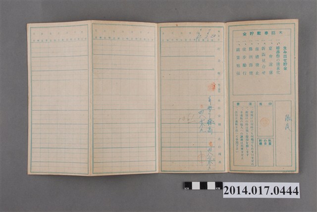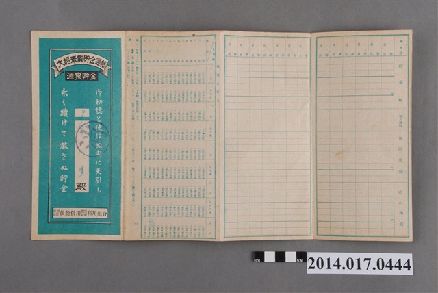 本物件為戰爭期間1943年~1945年期間後龍、公司寮、水尾子、二張犁、大山腳、頭湖、崎頂等地人民之銷帳儲金簿,內頁印有大詔奉戴字樣,並以婚葬儀式簡化、宴會遠慮、新謁見合せ、虛禮廢止、節酒節煙、徒步勵行、副業勉強倡導儲金,另外印有儲簿規定如:不許轉讓、改印需申請等,背頁附有複利合計表。大詔指的是1941年對美、英兩國之宣戰詔書,1942年起每個月8日定為大詔奉戴日,為日本政府為太平洋戰爭所運作的國民運動,隨著戰爭規模擴大,戰時有各項國民強迫儲蓄的舉措,以支援前線戰事,1938年日本政府為因應中日戰爭即推行有愛國儲蓄運動,本物件則為1942年後因應戰爭規模擴大後之儲蓄項目,范雅鈞指出本儲金簿為強制存款,直接由薪資扣除。