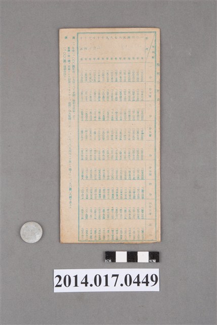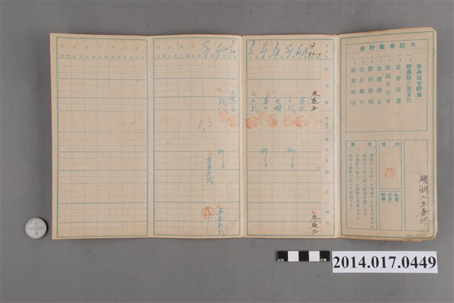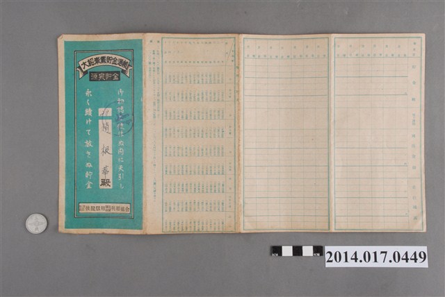 地址登載為頭湖85番地。本物件為戰爭期間1943年~1945年期間後龍、公司寮、水尾子、二張犁、大山腳、頭湖、崎頂等地人民之銷帳儲金簿,內頁印有大詔奉戴字樣,並以婚葬儀式簡化、宴會遠慮、新謁見合せ、虛禮廢止、節酒節煙、徒步勵行、副業勉強倡導儲金,另外印有儲簿規定如:不許轉讓、改印需申請等,背頁附有複利合計表。大詔指的是1941年對美、英兩國之宣戰詔書,1942年起每個月8日定為大詔奉戴日,為日本政府為太平洋戰爭所運作的國民運動,隨著戰爭規模擴大,戰時有各項國民強迫儲蓄的舉措,以支援前線戰事,1938年日本政府為因應中日戰爭即推行有愛國儲蓄運動,本物件則為1942年後因應戰爭規模擴大後之儲蓄項目,范雅鈞指出本儲金簿為強制存款,直接由薪資扣除。